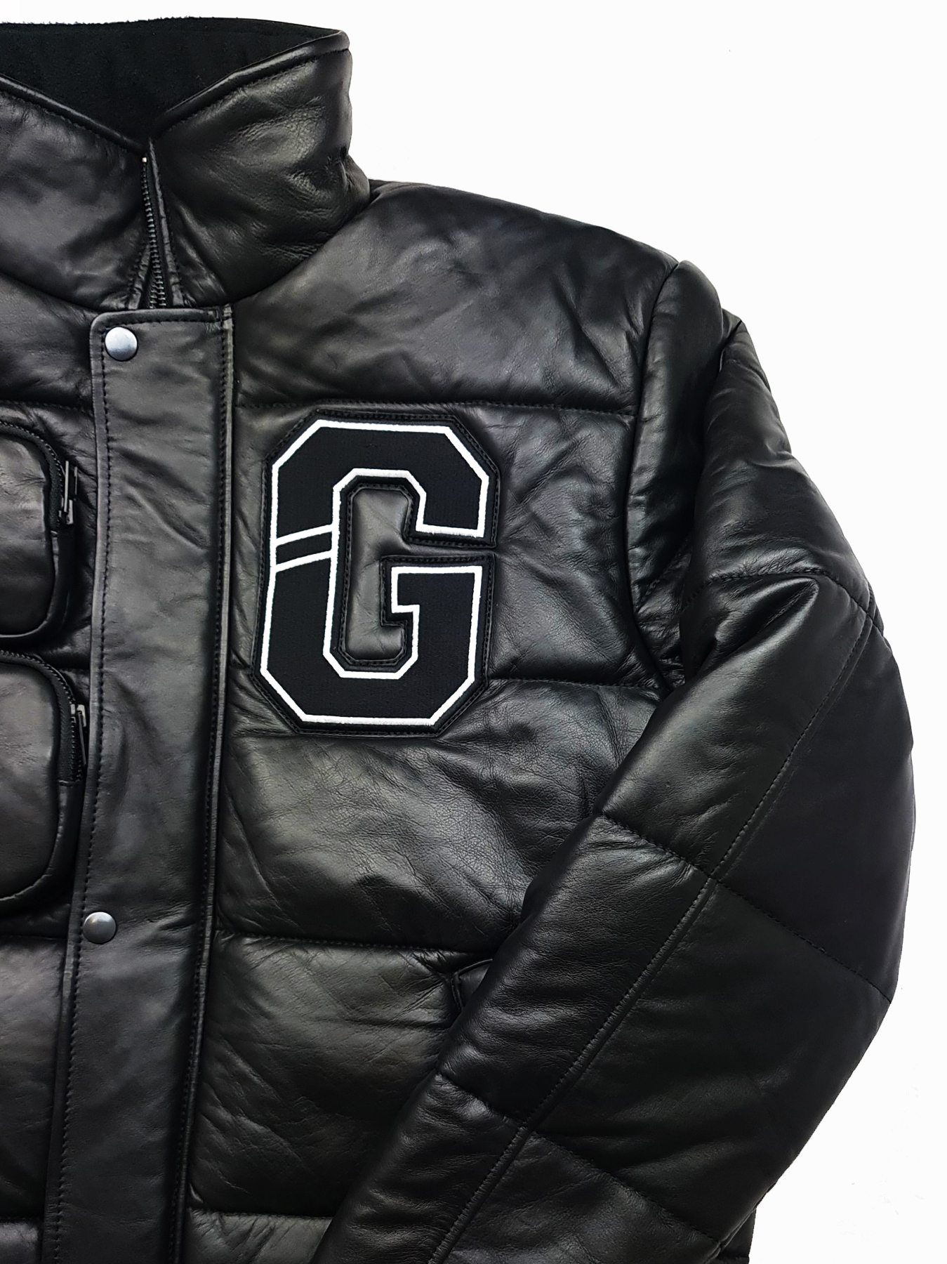 100% Italian Napa Leather, Rib, YKK zips, 3D Pockets, metal stud buttons. large Front embroidered College Font G. Arm embroidery of basketball style logo. 3D zip pockets